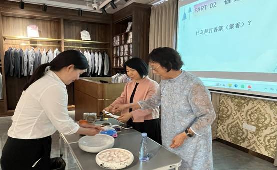本次活动特邀非遗企业广州市老山香业贸易有限公司的庄老师和周老师进行现场教学。老师们系统介绍了香道文化的历史脉络与精神内涵,阐述了香道与“衣食住行”、中医药、美学文化及个人修养的密切联系,并重点讲解了宋代篆香的文化渊源与操作礼仪。