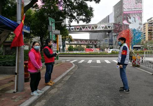 2月14日,党员邓振杰响应纺织工贸集团总部的号召,参加了越秀区大塘街道志愿者防疫行动,对大塘街道进出的居民进行体温检测和派发宣传单张,劝说未按规定佩戴口罩的居民佩戴好口罩。